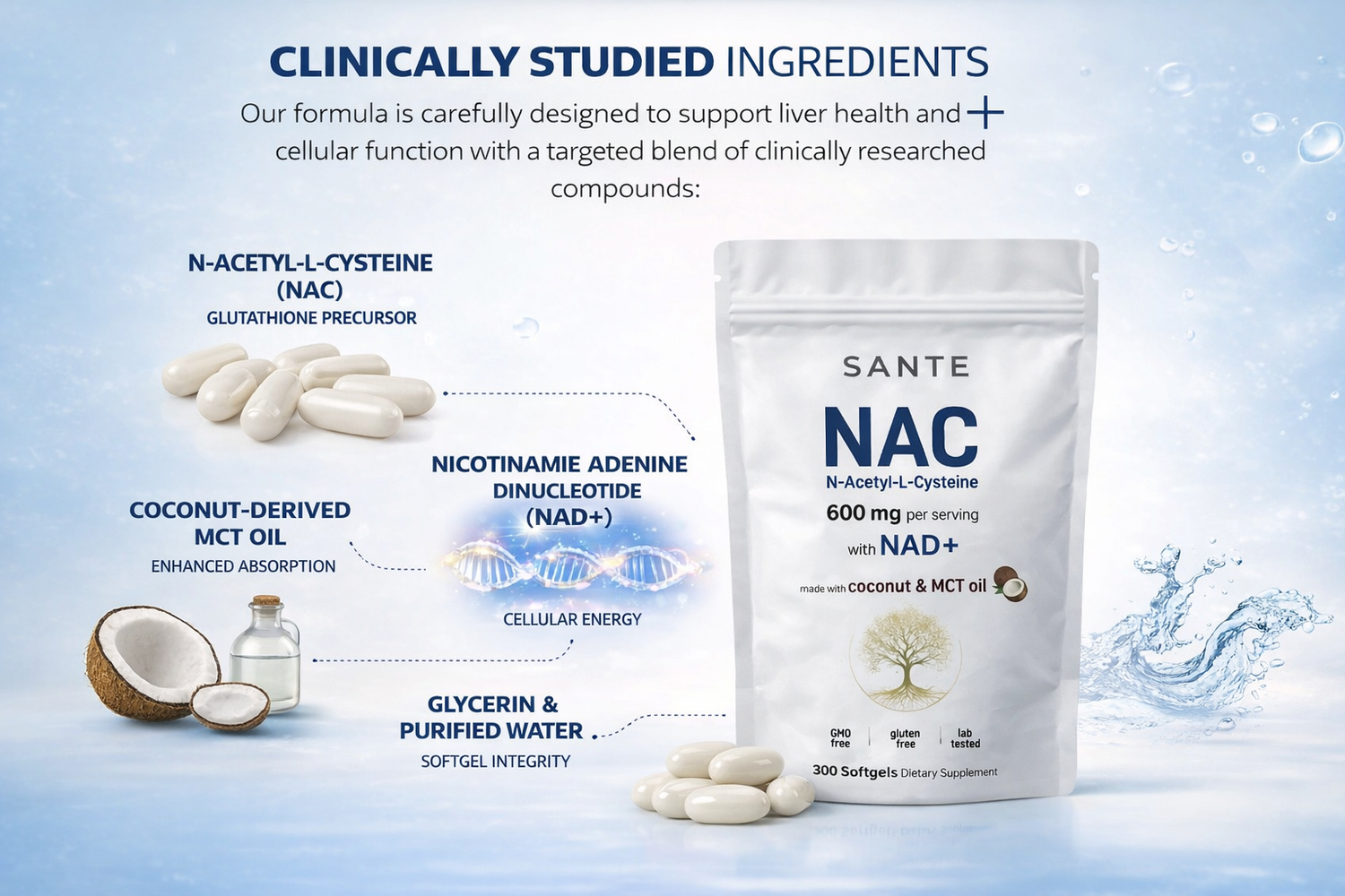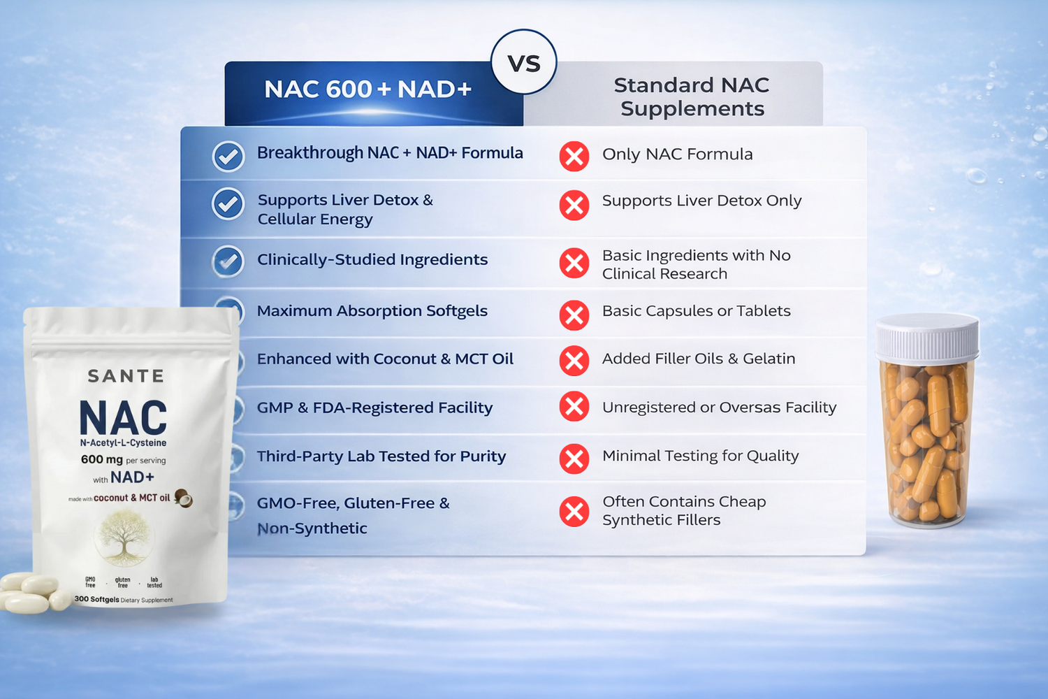 Targeted cellular support. Many supplements focus on surface-level benefits. NAC 600 + NAD+ works at a deeper level by supporting glutathione production, cellular energy, and mitochondrial function. The clinical-strength NAC dose combined with NAD+ and MCT oil for absorption sets this formula apart from basic antioxidant or detox products.